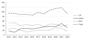 Considering the general patent landscape, our research suggests the number of patent applications that have published (in US, China and Europe) which relate to anti-wrinkle products and treatments, and which also describe Botox®, has steadily risen over the last 10 years. The steady increase in the number of patent applications again reflects the significant size of the cosmetics and anti-wrinkle market (see Figure 1 below). As shown in Figure 1 below, a significant amount of this growth has been driven by patent applications being filed in China, with the number of applications in the US and Europe remaining in a generally steady state. The data also suggests that the number of applications published decreased in 2022, perhaps reflecting a reduction in the overall number of patent applications filed in 2020 due to the COVID-19 pandemic. It will be interesting to see whether the overall number of applications published in this sector returns to pre-pandemic levels over the coming years.