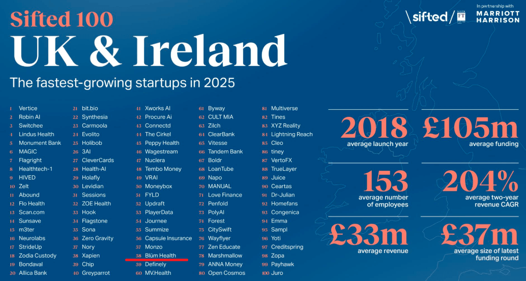 Blüm Health, a trailblazer in digital health innovation and a valued member of Medilink Midlands, has been named among the Top 100 fastest-growing startups in the Sifted 100: UK & Ireland 2025 leaderboard. Founded and led by Dr Michael Watts MBA MBChB BSc (Hons)—Young Health Tech Leader of the Year...